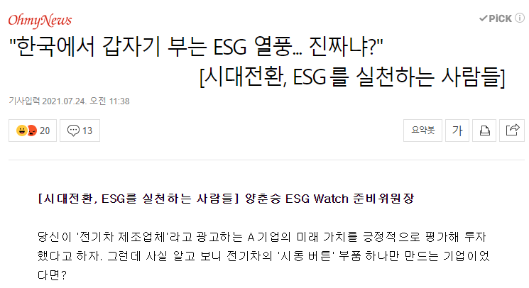 양 위원장은 "다소 애매한 개념인 CSR과 달리 ESG가 얼핏 그 내용을 구체화하고 있다는 점에서 한결 수월해 보이지만, 오히려 속을 파고들면 더 골치 아픈 상황"이라고 말했다. 이전에는 경제적으로 어려운 가정에 연탄을 제공하고 사회적 책임이라 이름 붙이는 일이 자주 벌어졌는데, 이제 손쉽게 '책임'이라는 단어를 쓰기는 불가능하다.